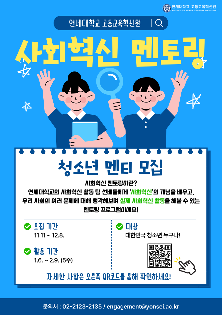 - ☏ 02-2123-2135 / engagement@yonsei.ac.kr (연세대학교 고등교육혁신원 사회참여센터)