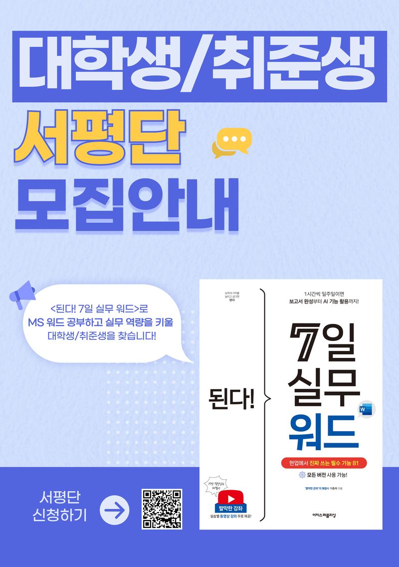 📢《된다! 7일 실무 워드》로 MS 워드 공부하고 실무 역량을 키울 대학생/취준생 서평단을 모집합니다.