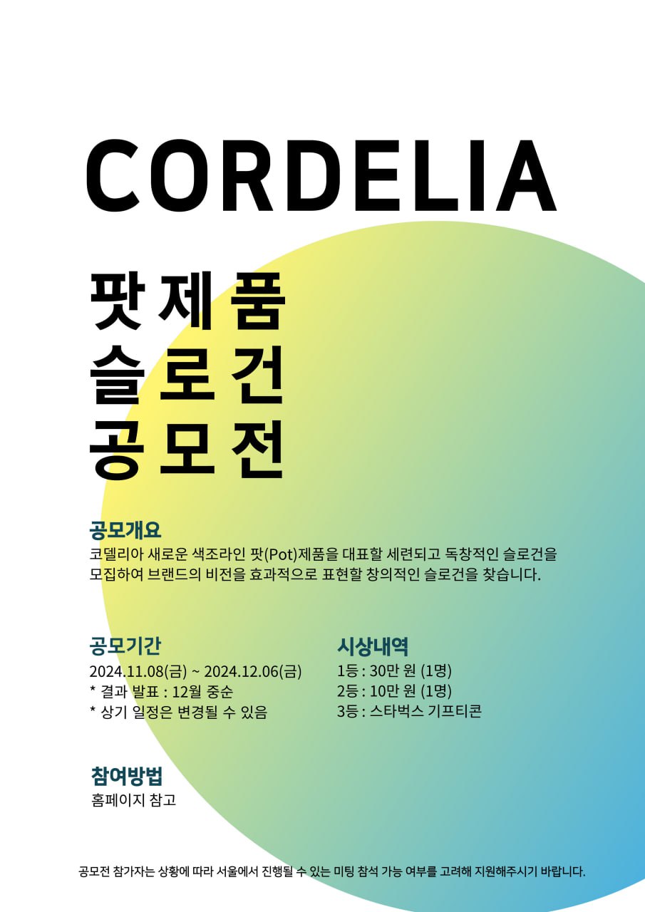 자연속에서 해답을 찾는 자연주의 코스메틱 브랜드 코델리아에서 새롭게 출시예정인 색조라인 치크팟을 위한 슬로건 공모전을 개최합니다.