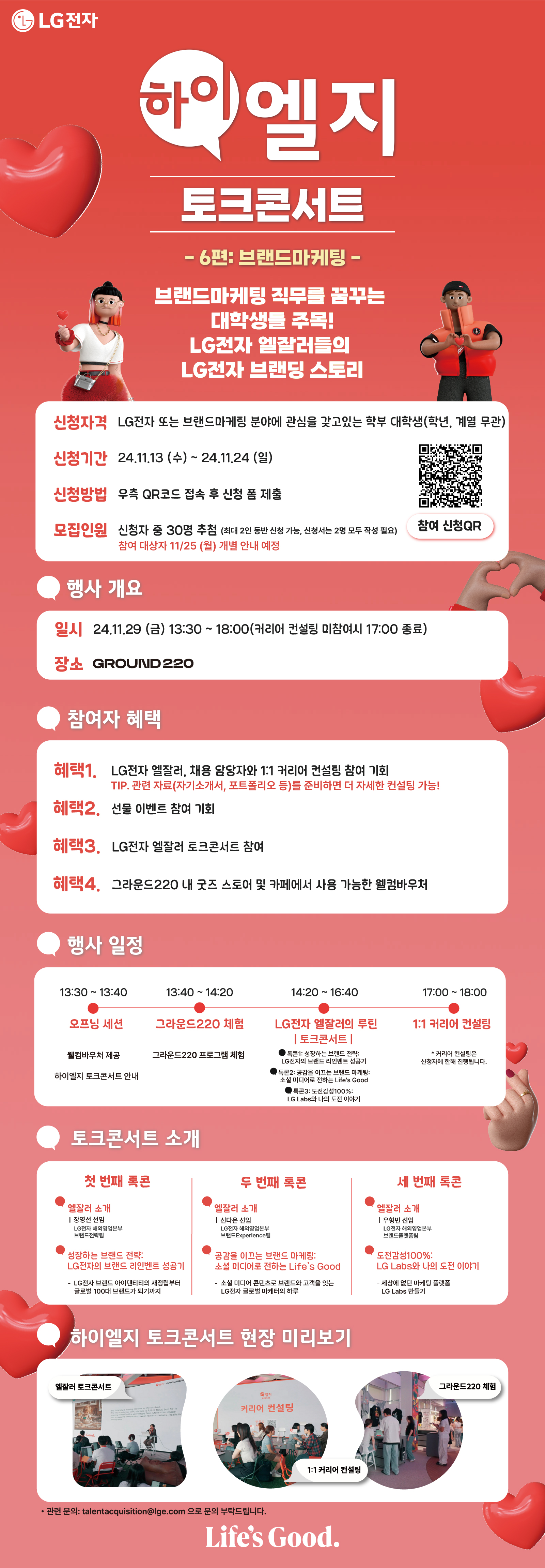 하이엘지 토크콘서트에서 자신의 미래를 상상해보고, 한 층 더 성장하고 싶은 브랜드마케팅 직무 또는 LG전자에 관심 있는 대학생 분들의 참여를 기다립니다❤