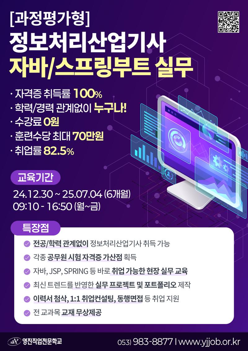 본 과정은 전액 무료 국비과정으로 학력/경력에 관계없이 누구나 정보처리산업기사 자격증을 취득 뿐 아니라 국내 IT 기업에서 가장 수요가 높은 언어인 자바 실무 개발자를 양성하는 과정입니다.