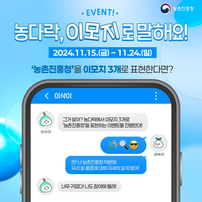 예시) ‘🌾🔍😎’ 농촌진흥청 덕분에 우리 쌀 품종에 대해 자세히 알게 됐어요!