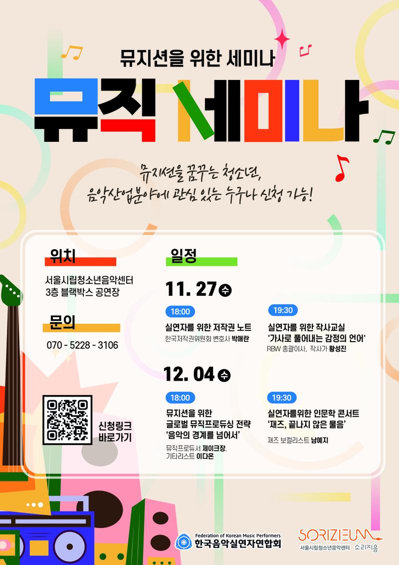 뮤지션을 꿈꾸는 청소년과 음악을 좋아하는 모든 분들을 위한 세미나!