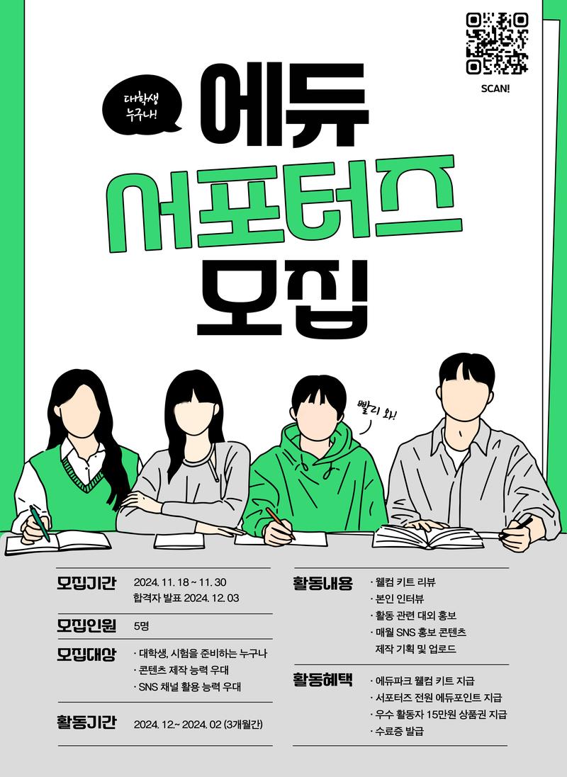 - 활동혜택: 에듀파크 웰컴키트, 우수서포터즈 15만원 상당 상품권, 서포터즈 전원 에듀파크 적립금 30,000원, 수료증 발급
