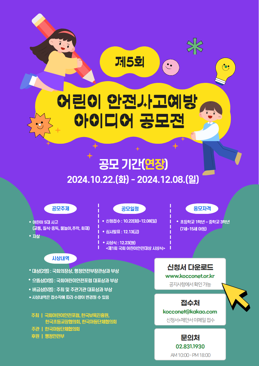 접수방법 : 한국아동단체협의회 홈페이지 ▶ 공지사항 ▶「제5회 아동 안전 아이디어 공모전」 서식 다운 ▶ 공모전 온라인 접수 (이메일 접수 : kocconet@kakao.com)