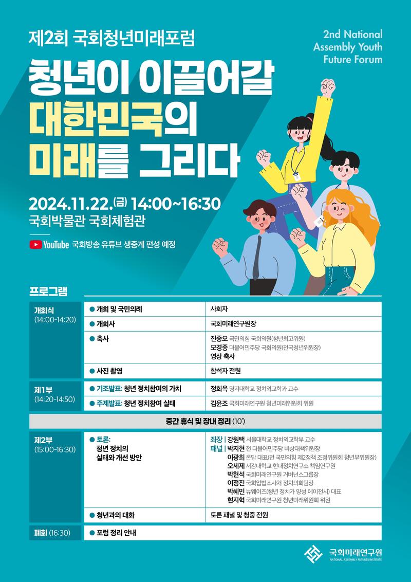 본 연구원 직속 청년미래위원회에서 <청년 정치참여 활성화>를 주제로 포럼을 진행하고자 합니다.