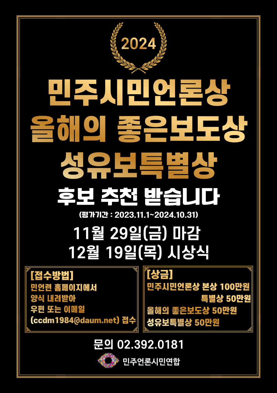 [민주언론시민연합 보도자료] 2024년 민주시민언론상·올해의 좋은 보도상·성유보특별상 후보 추천 접수