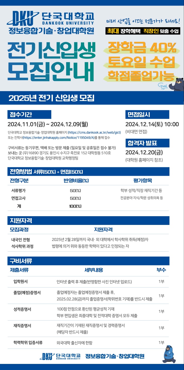 단국대학교 정보융합기술·창업대학원에서 2025년 전기 신입생을 모집합니다.