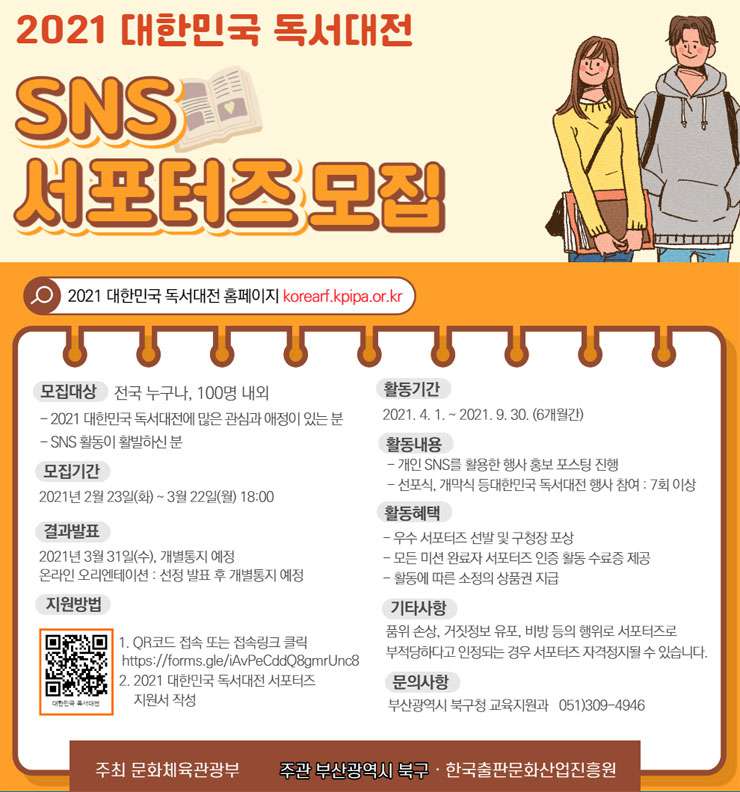 2021 대한민국 독서대전이 부산광역시 북구에서 개최됩니다. 부산광역시 북구청에서는 참신한 아이디어로 다양한 온라인 플랫폼을 통해 '2021 대한민국 독서대전'을 함께 홍보할 당신과 함께 하고 싶습니다.