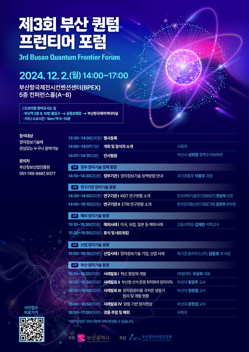 『제3회 부산 퀀텀 프런티어 포럼』은 양자정보기술에 대한 심도 있는 이해와 미래 준비를 위한 통찰을 제공합니다. 이번 포럼에서는 국내외 양자기술의 정책 동향과 활용 사례를 소개하며, 관련 분야의 전문가와 함께 미래를 논의하는 소중한 기회를 제공합니다. 양자정보기술에 관심 있는 여러분의 많은 참여를 바랍니다.