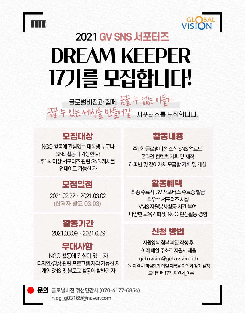 2021년 NGO 글로벌비전 GV SNS 드림키퍼 17기 모집 안내