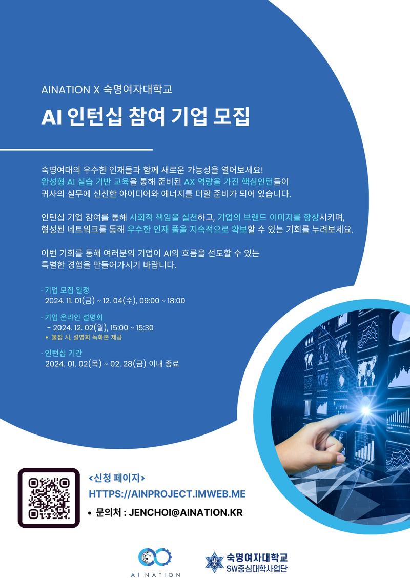 관련하여 에이아이네이션이 진행하는 숙명여대 학생 대상 AI 인턴십 프로그램을 다양한 기업에 소개해드리고자 합니다.