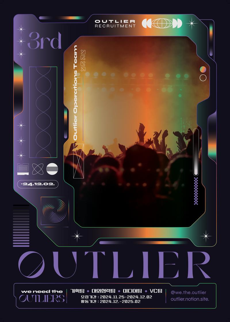 📍 아웃라이어는 실력 있는 아티스트들이 꿈을 포기하지 않고 그들의 음악을 지속할 수 있도록 서포트한다는 미션을 가지고 작년 7월부터 시작되어 온 청년 비영리 문화예술단체이자 대학생 음악 크루입니다. 기본적인 실력을 가진 분들이 모여 남다른 가치를 만드는 하이밸류 음악 커뮤니티로의 방향성만 고집합니다.