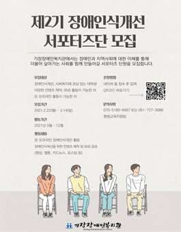 기장장애인복지관에서는 장애인을 바르게 이해하고 함께 살아가는 지역사회를 만들어 나가기 위해 서포터즈단을 모집하고자 합니다. 지역 내 대학생들의 많은 참여 바랍니다.