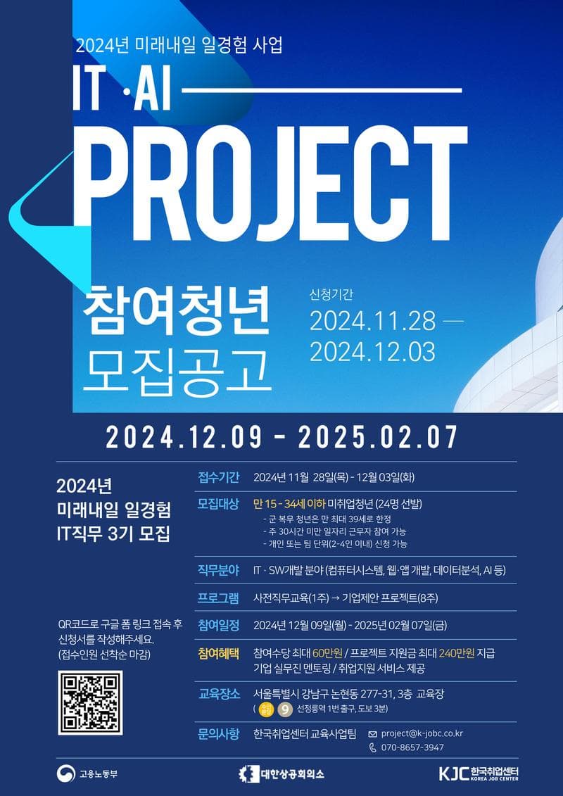 📌 고용노동부-대한상공회의소 주최 / 한국취업센터 운영 프로그램 "2024년 미래내일 일경험 프로젝트"를 통해 청년 여러분들에게 IT·SW개발 분야에서의 취업역량과 직무능력을 스펙업할 수 있는 특별한 기회를 제공하고자 합니다.
