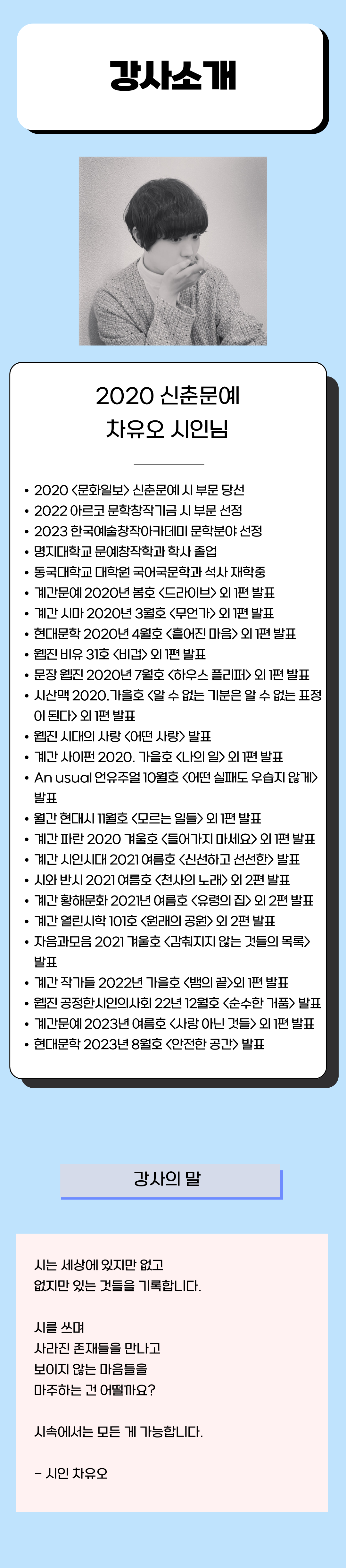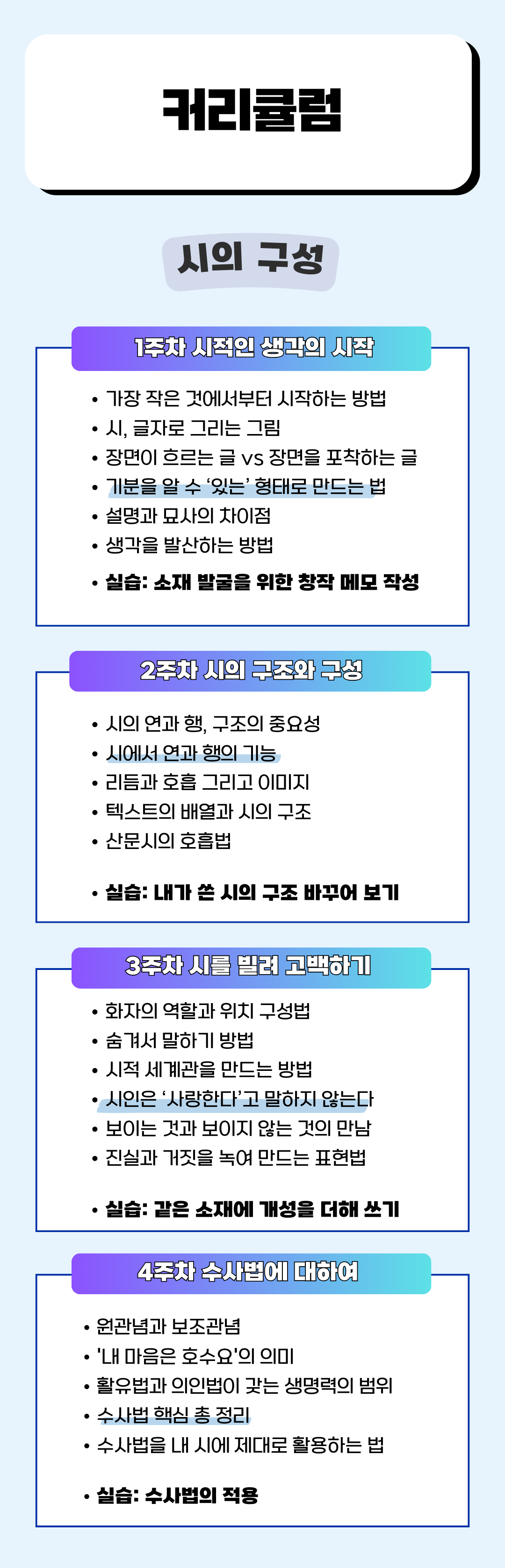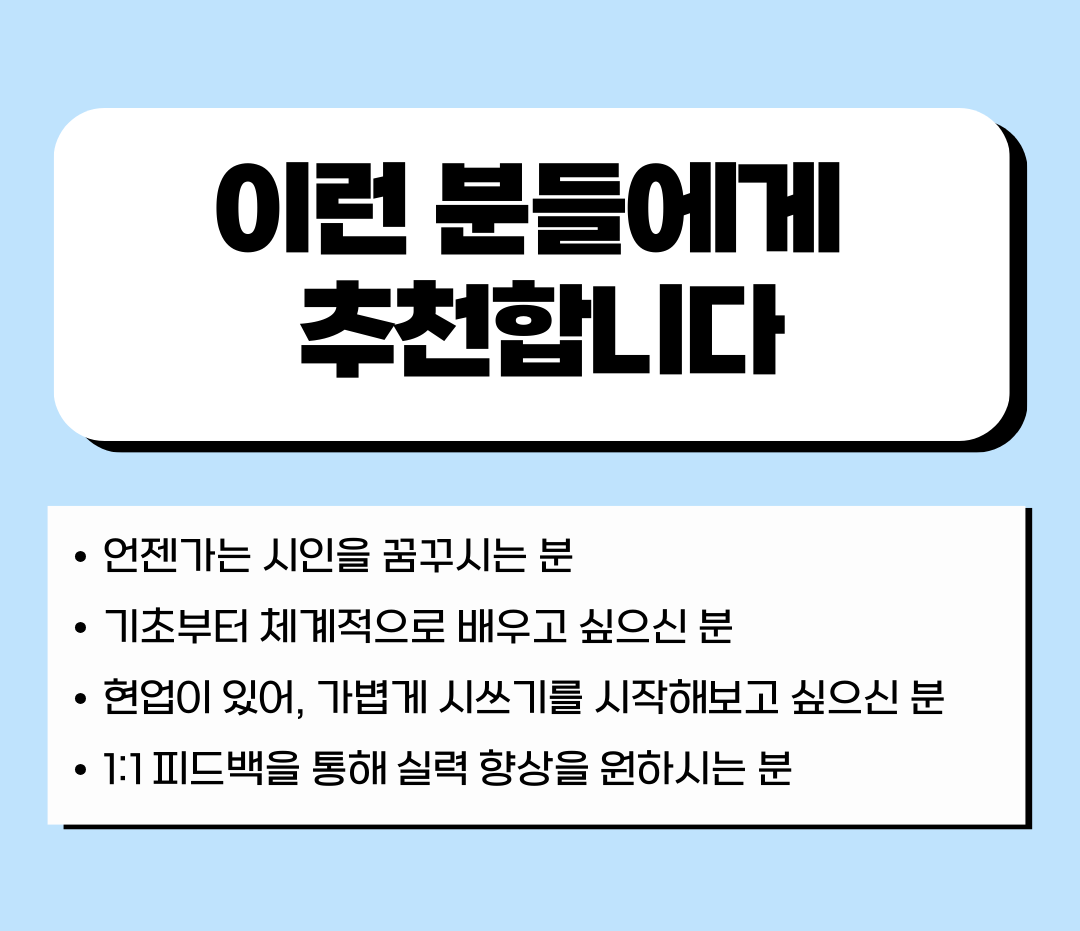 제대로 시쓰기를 배우고, 시인으로서의 첫 스텝을 밟고자 하시는 분들께 이 프로그램을 추천드립니다.