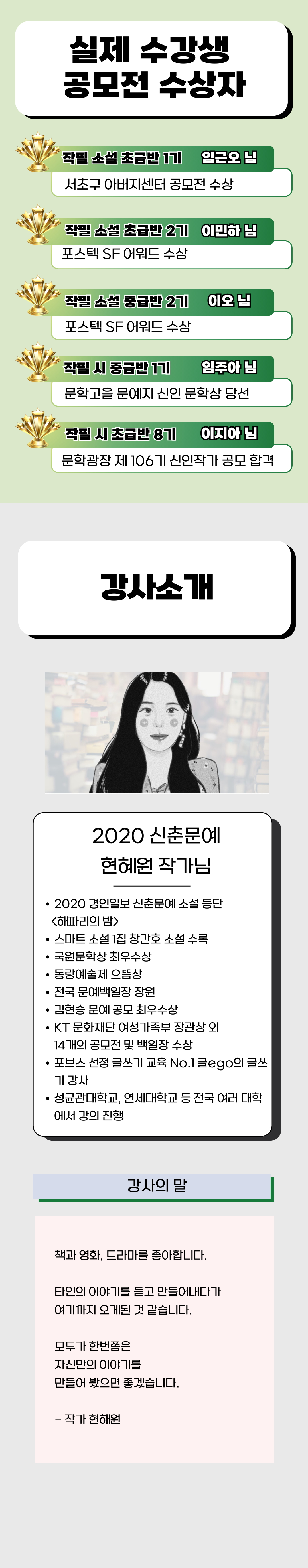 제대로 소설 쓰기를 배우고, 소설가의 첫 스텝을 밟고자 하시는 분들께 이 프로그램을 추천드립니다.