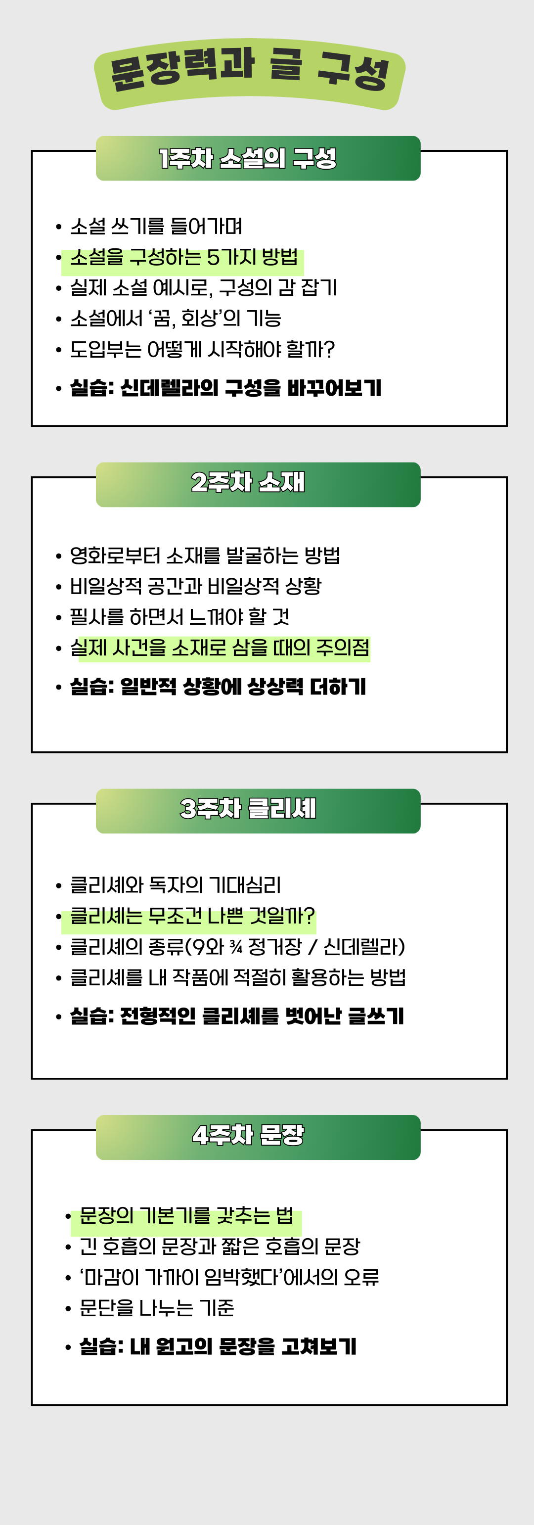 작필 소설 초급반은 ‘묘사와 시점’과 ‘문장력과 글 구성’ 프로젝트가 번갈아 가며 개설됩니다. 각각 4주 과정으로, 가볍게 시작하실 수 있도록 나누어 구성하였습니다.