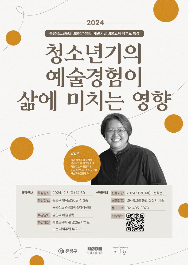 중랑청소년문화예술창작센터(아트청)에서는 개관을 기념하여 학부모 및 지역주민을 대상으로 예술교육의 필요성에 대한 특강을 진행합니다.청소년기의 예술경험이 정서적 안정감,창의력 발달과 사회적 소통 능력에 미치는 긍정적 영향을 알아봅니다.