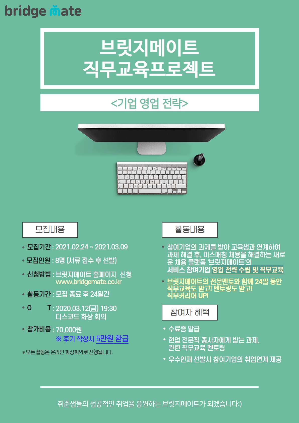 미스매칭 채용 해결 플랫폼 <브릿지메이트>에서 기업영업 전략 수립 직무교육 참여자를 모집합니다