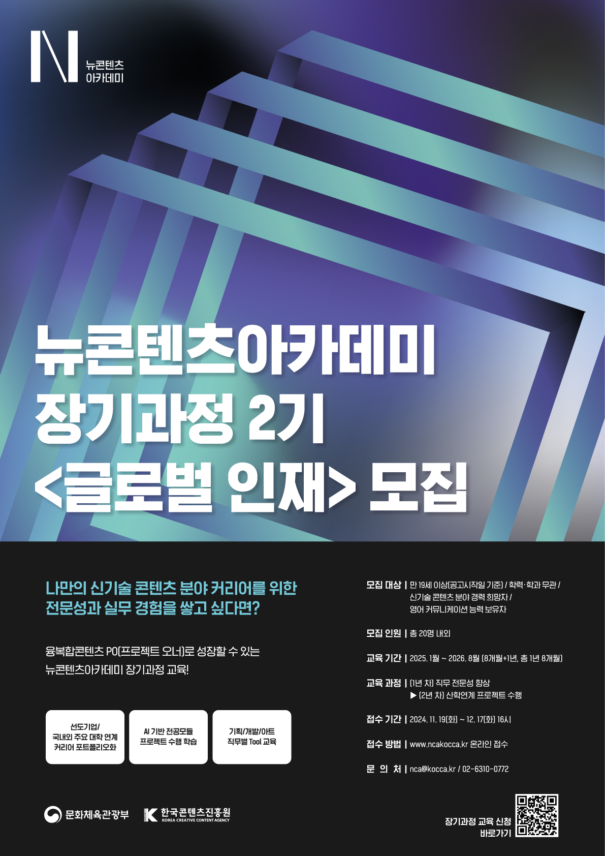 - 19세 이상(공고 시작일 기준) / 학력˙학과 무관 / 신기술 콘텐츠 분야 경력 희망자