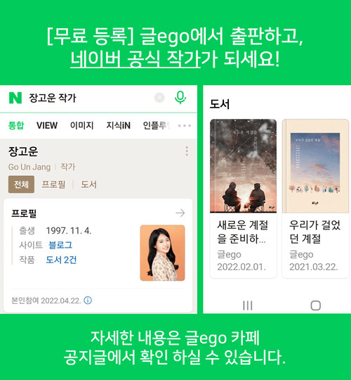 글ego와 함께 책을 내신 저자님이라면 누구나 가능합니다! 자세한 내용은 글ego 카페 공지글에서 확인하실 수 있습니다.
