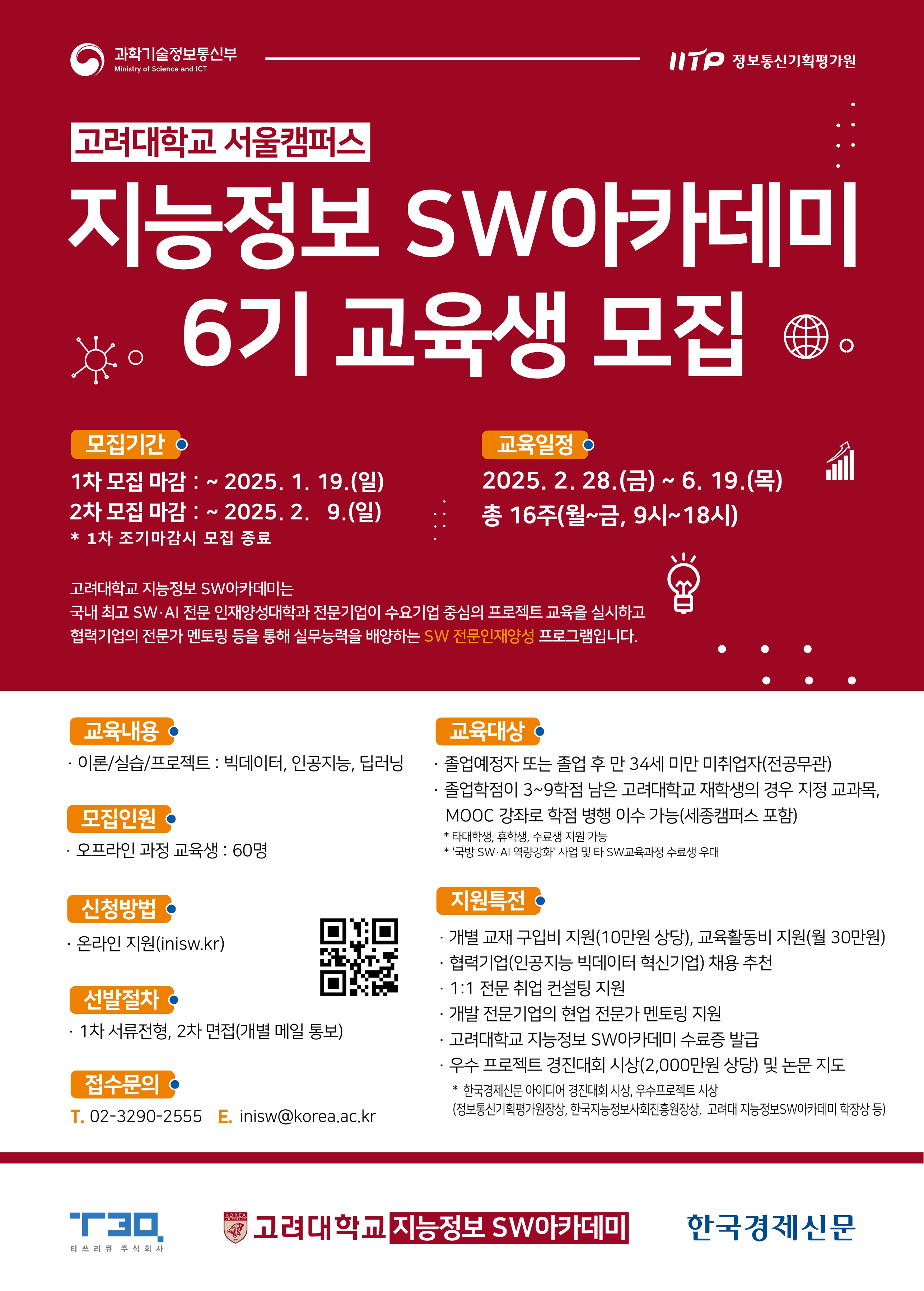 고려대학교 지능정보 SW아카데미에서는 SW기술, 인공지능 역량을 갖춘 융합형 데이터 전문 SW인재를 양성하기 위해 6기 교육생을 모집하고 있습니다. 많은 관심과 적극적인 참여 부탁드립니다. 🙌