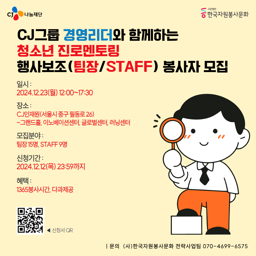 “2024 CJ그룹 경영리더(임원급)와 함께하는 청소년 진로멘토링” 봉사자 모집 (~12/12)