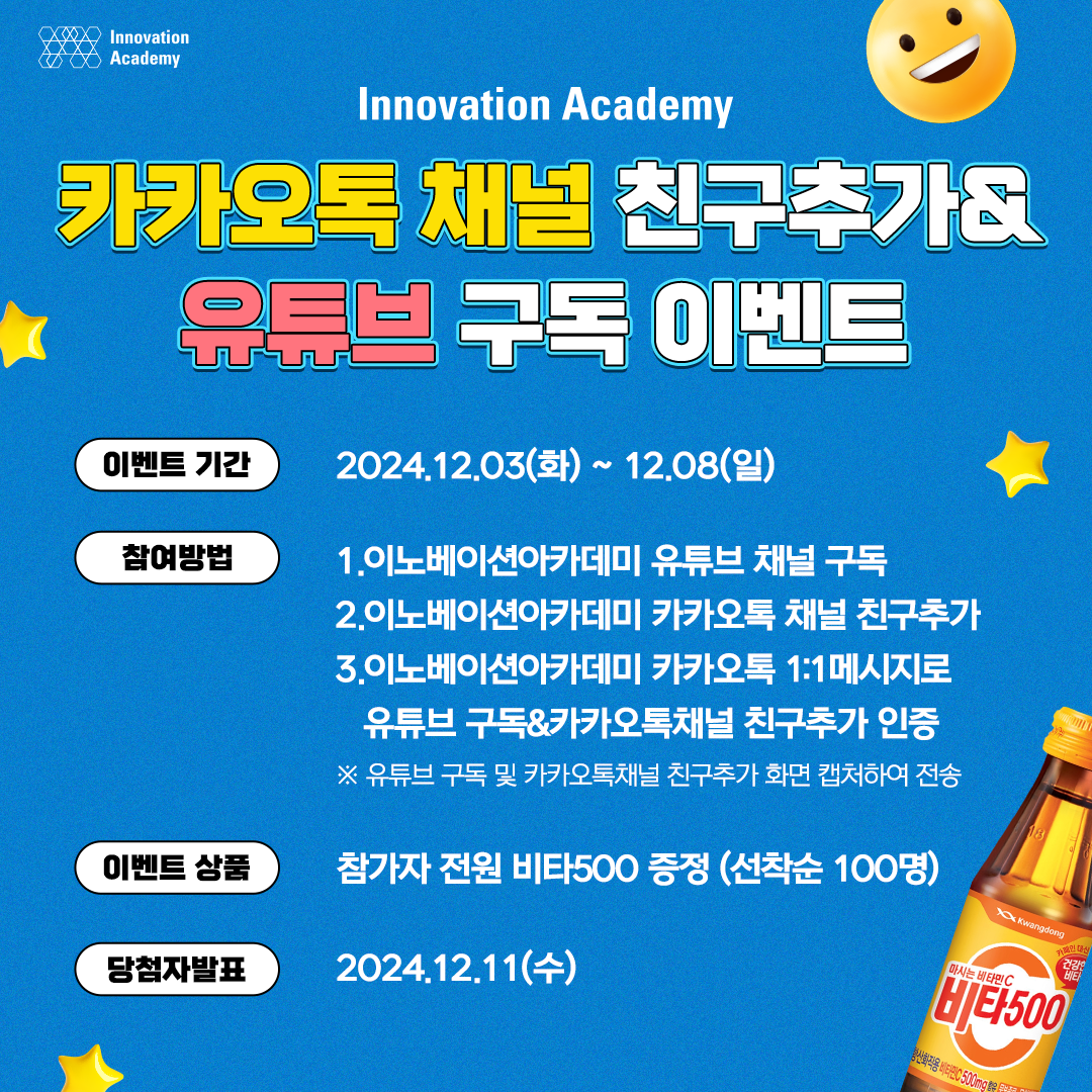 이노베이션아카데미가 카카오톡 친구추가 & 유튜브 구독 이벤트로 돌아왔어요 ☺