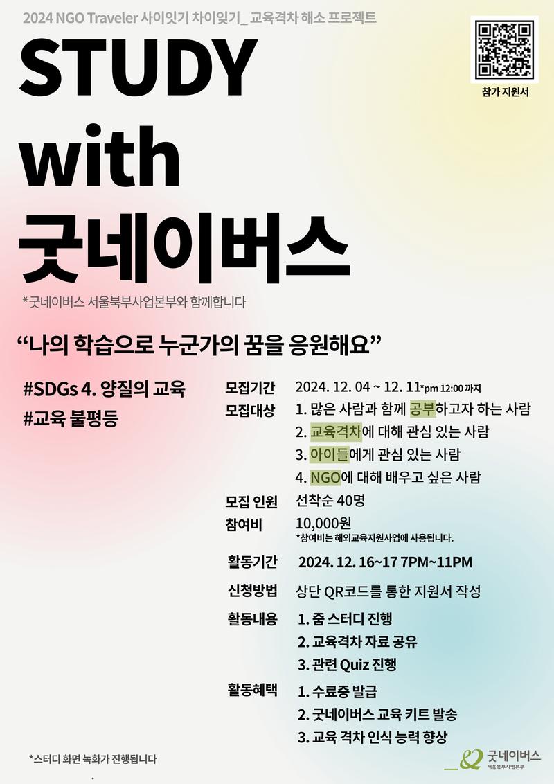 ‘STUDY with 굿네이버스(북부) ’는 세계 교육 격차 문제를 고민하고, 이를 해결하기 위한 작은 실천을 시작하는 캠페인입니다.