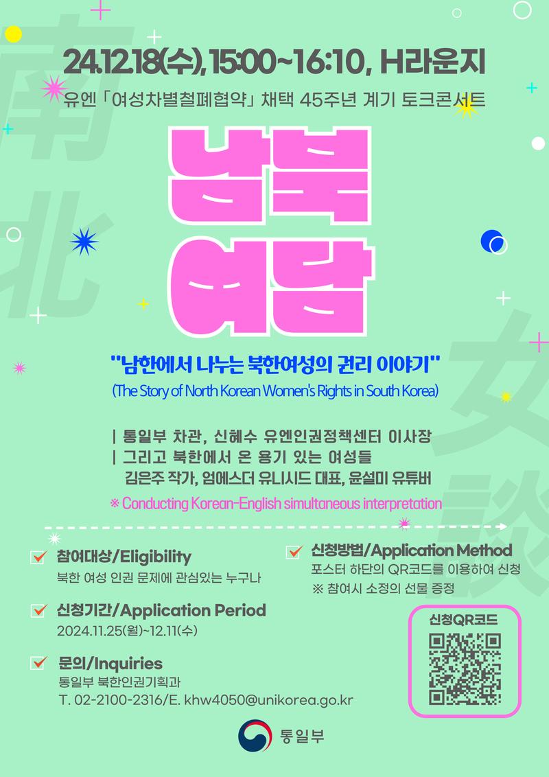 The Ministry of Unification is pleased to invite you to a special talk concert commemorating the 45th anniversary of the adoption of the UN Convention on the Elimination of All Forms of Discrimination Against Women (CEDAW) on December 18, 1979. This event aims to provide an opportunity to share the real-life experiences of North Korean women through discussions with experts in women's rights and courageous North Korean female escapees. We would be delighted to have your participation in this meaningful event.