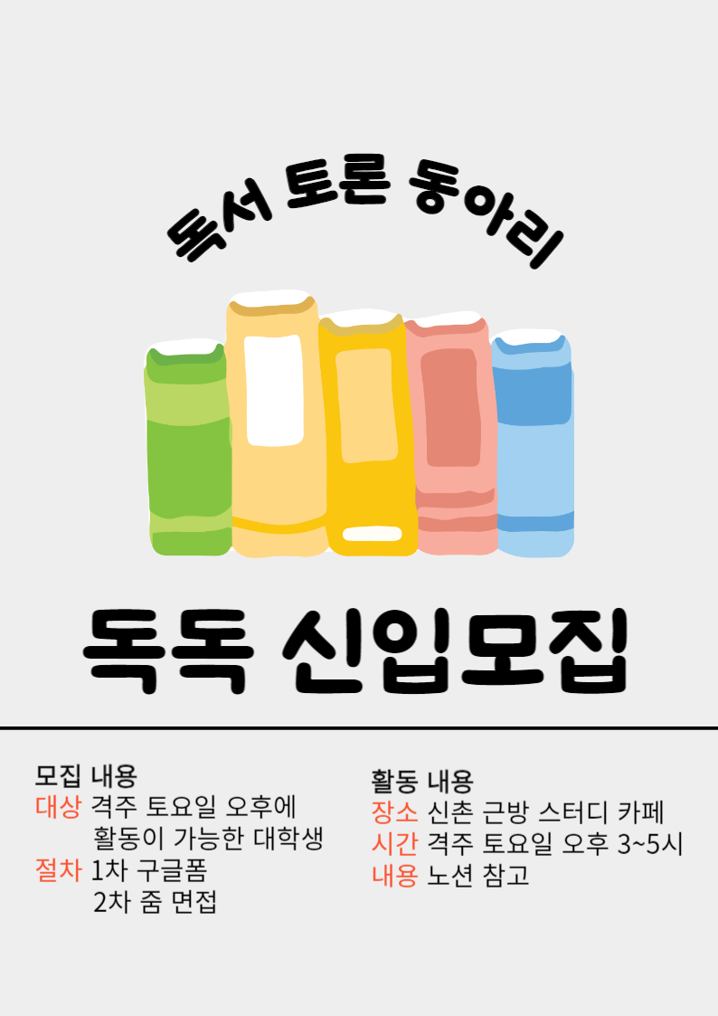 독독 동아리는 독서 토론 동아리입니다. 주제에 맞는 책을 각자 투표를 하여 한 달 단위로 2권의 책을 선정합니다. 선정한 책을 기반으로 각자 발제문을 작성하여 독서 토론을 진행합니다. 독서 토론은 2주에 한 번씩 신촌 근방 스터디룸을 대관하여 진행합니다.