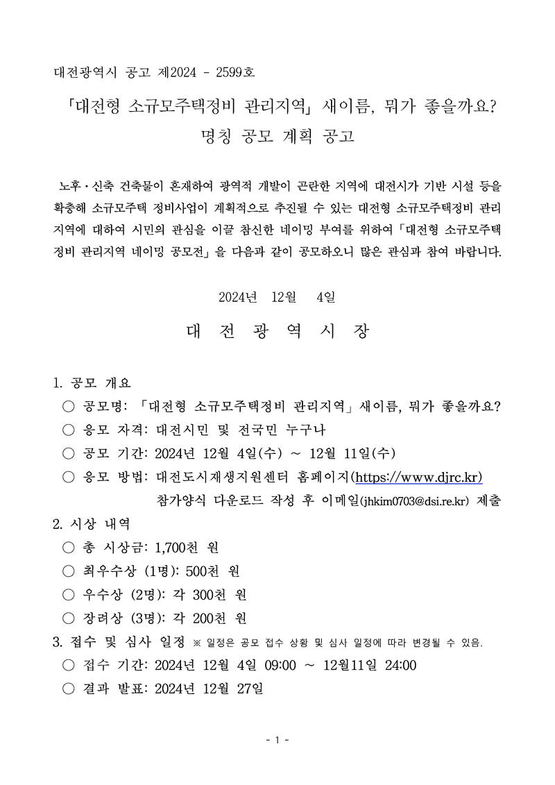 노후․신축 건축물이 혼재하여 광역적 개발이 곤란한 지역에 대전시가 기반 시설 등을 확충해 소규모주택 정비사업이 계획적으로 추진될 수 있는 대전형 소규모주택정비 관리지역에 대하여 시민의 관심을 이끌 참신한 네이밍 부여를 위하여「대전형 소규모주택정비 관리지역 네이밍 공모전」을 다음과 같이 공모하오니 많은 관심과 참여 바랍니다.