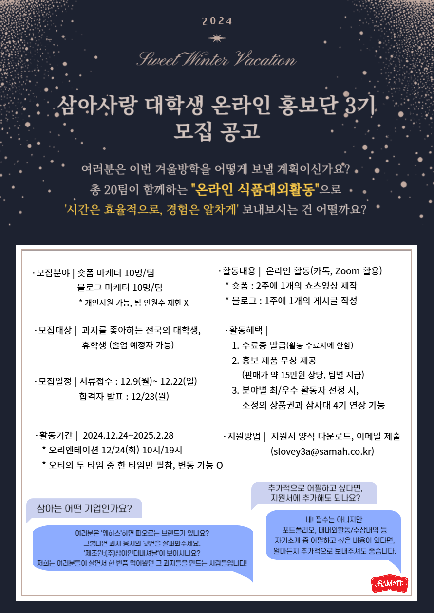 소비자들이 안심하고 먹을 수 있는 과자를 만드는 회사, ㈜삼아인터내셔날에서 과자를 좋아하고 콘텐츠 기획과 제작에 관심이 많은 '삼아사랑 대학생 온라인 홍보단 3기'를 모집합니다!
