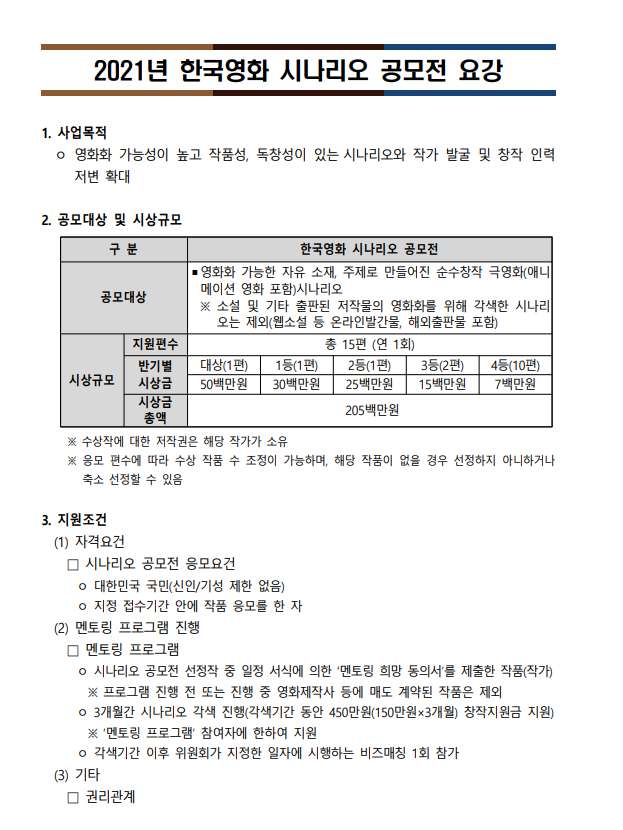 - 영화화 가능한 자유 소재, 주제로 만들어진 순수창작 극영화(애니메이션 영화 포함)시나리오