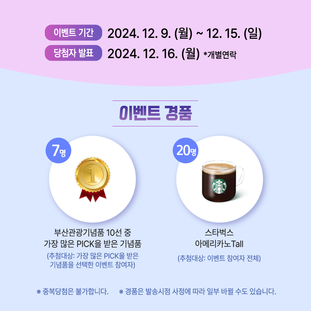 ■ 이벤트 경품│부산관광기념품 10선 중 가장 많은 PICK을 받은 기념품 7명 / 스타벅스 아메리카노 Tall 20명