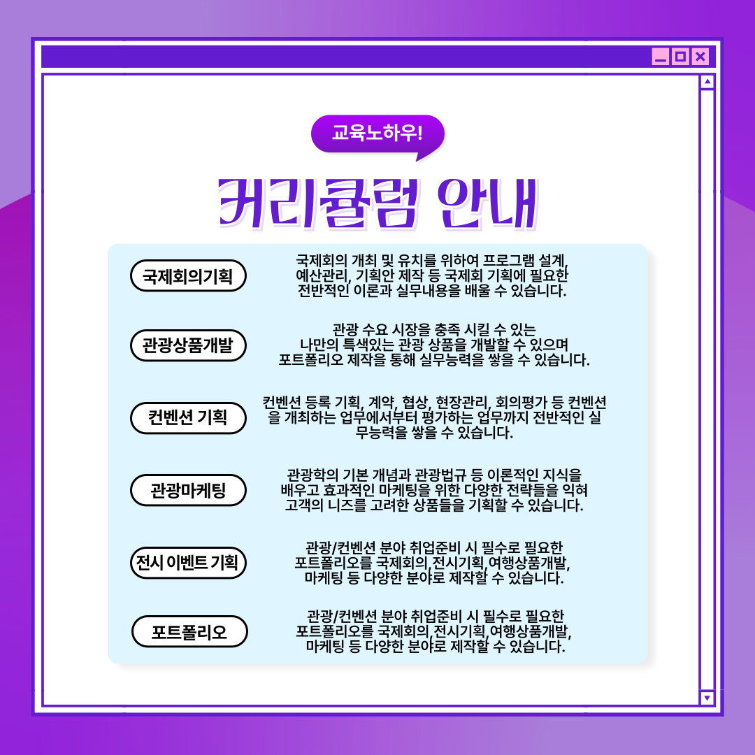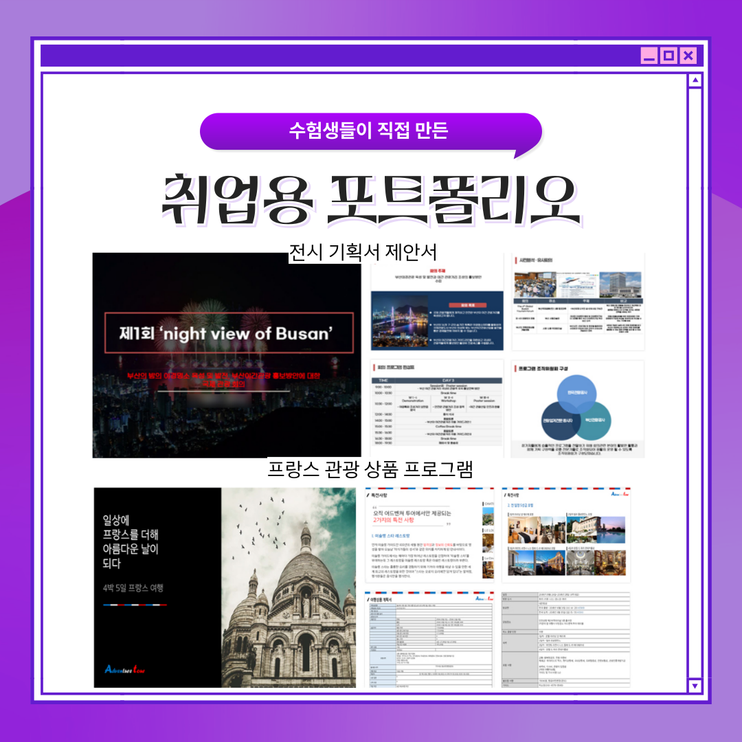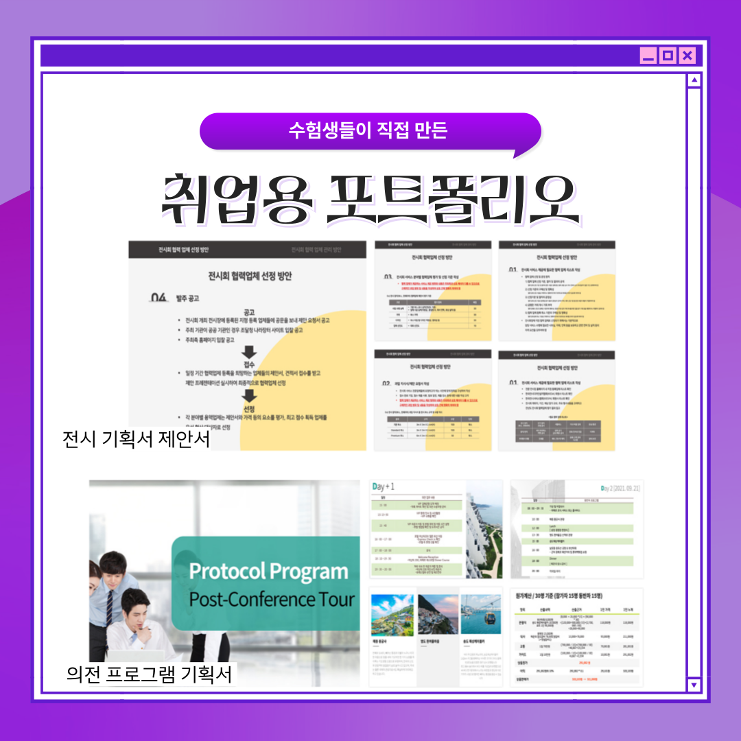 • 포트폴리오 제작: 국제회의, 전시 기획, 여행 상품 등 다양한 분야의 실무 중심 포트폴리오 완성