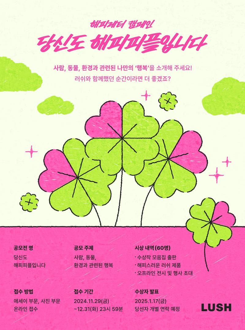 러쉬코리아는 보다 러쉬스러운 세상을 만들고자 고객들의 행복과 관련된 사연을 취합하는 공모전을 개최합니다.