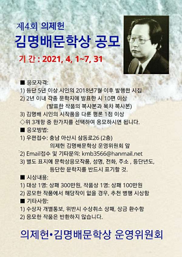 1) 우편접수 : 충남 아산시 삼동로26(2층) 의제헌 김명배문학상 운영위원회 앞