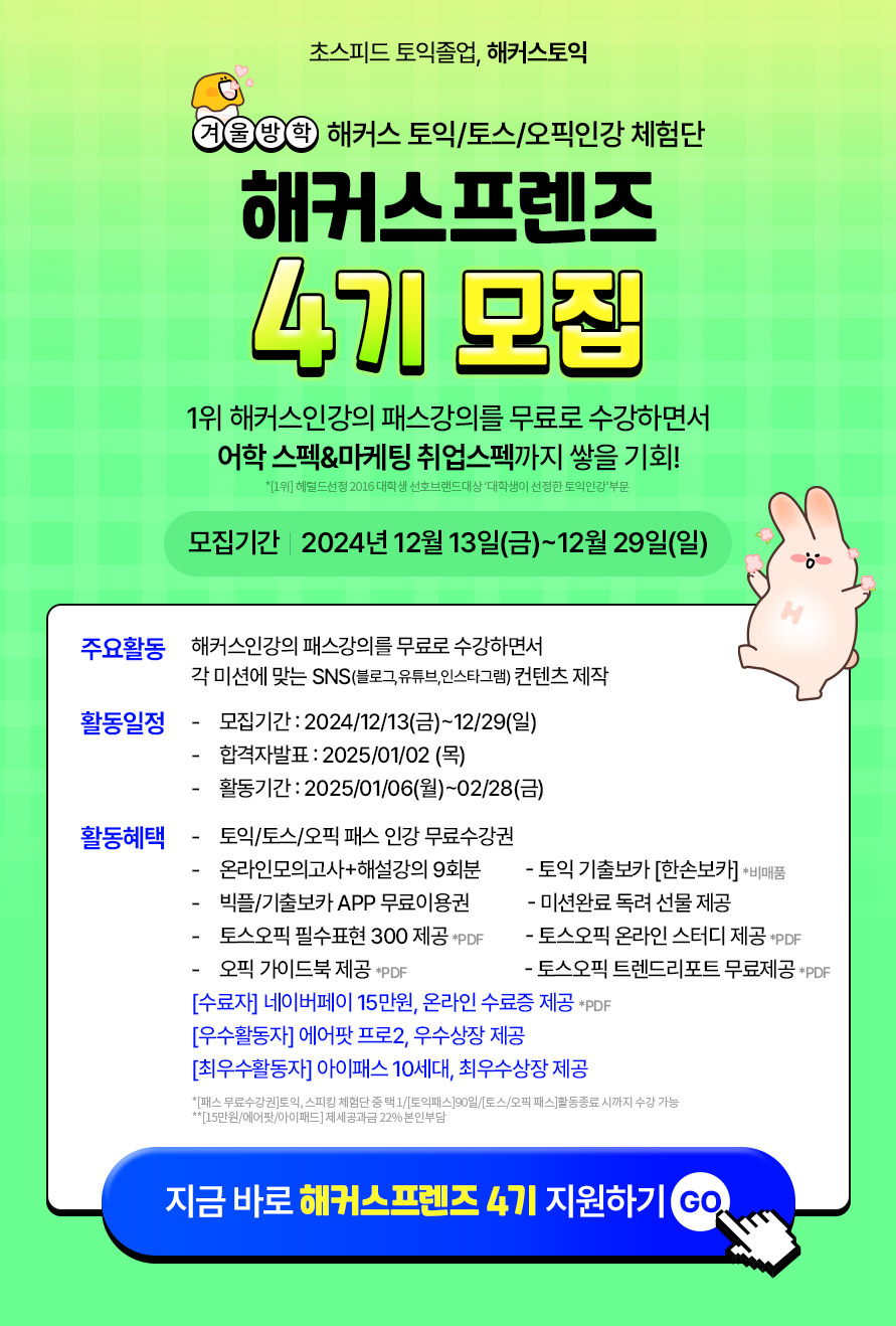 - 체험단 활동을 통해 제공된 해커스 토스오픽 강의는 활동종료 시까지 수강 가능합니다.
