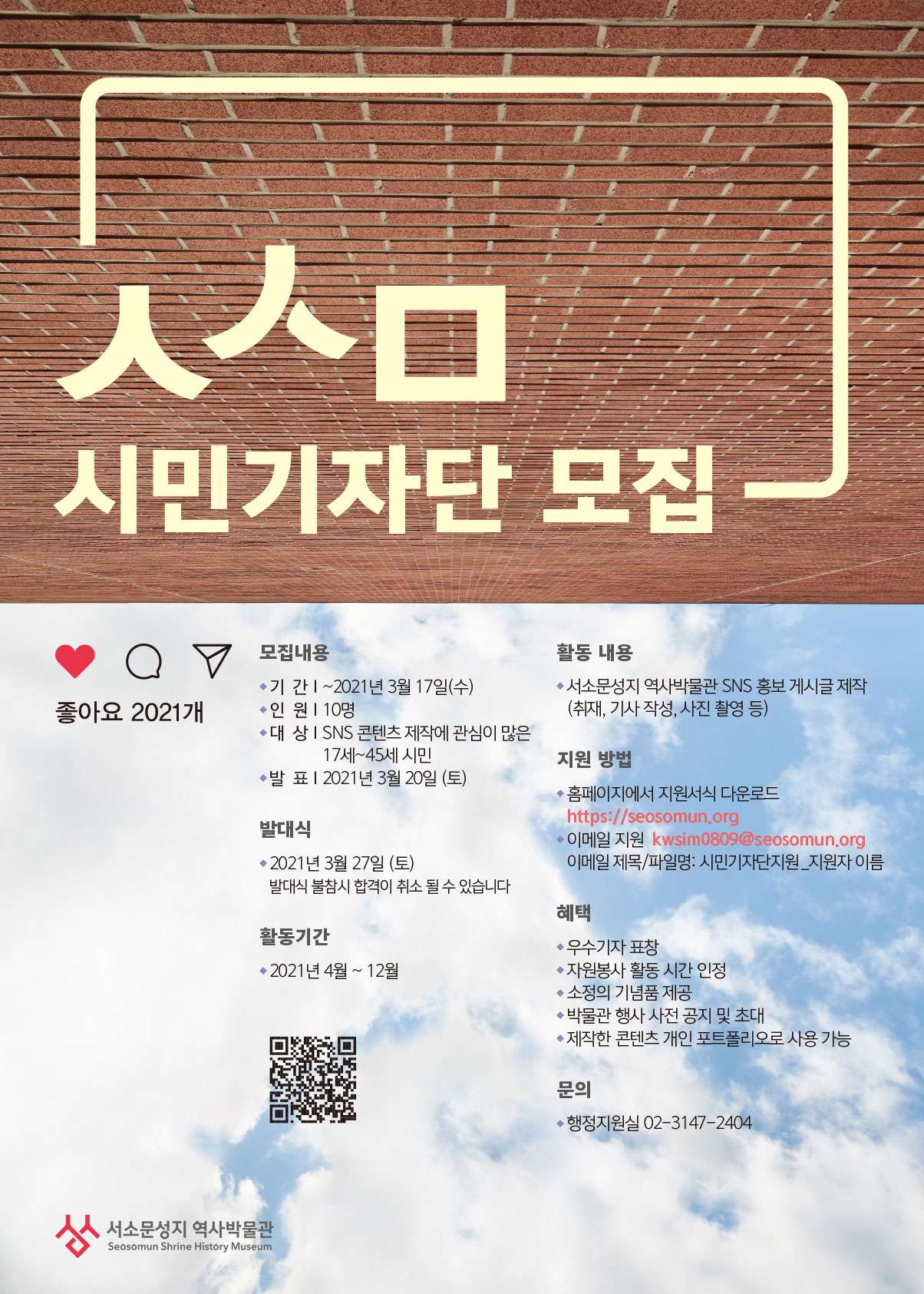서소문성지 역사박물관 홈페이지에서 [2021년 ㅅㅅㅁ시민기자단 지원서]을 다운받아 작성 후 kwsim0809@seosomun.org으로 보내주시기 바랍니다.