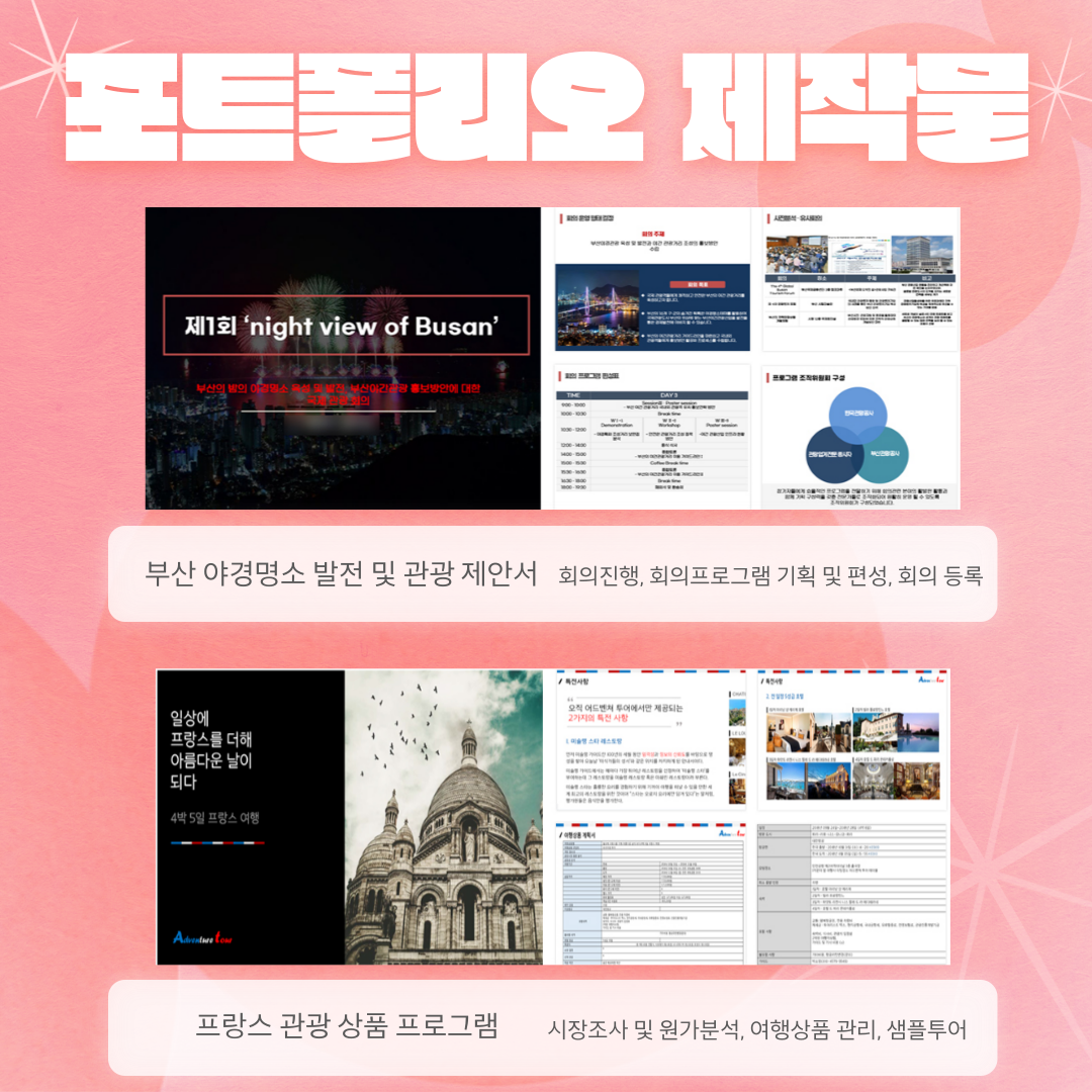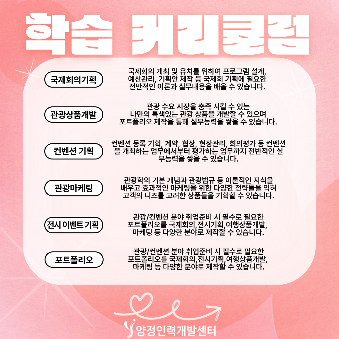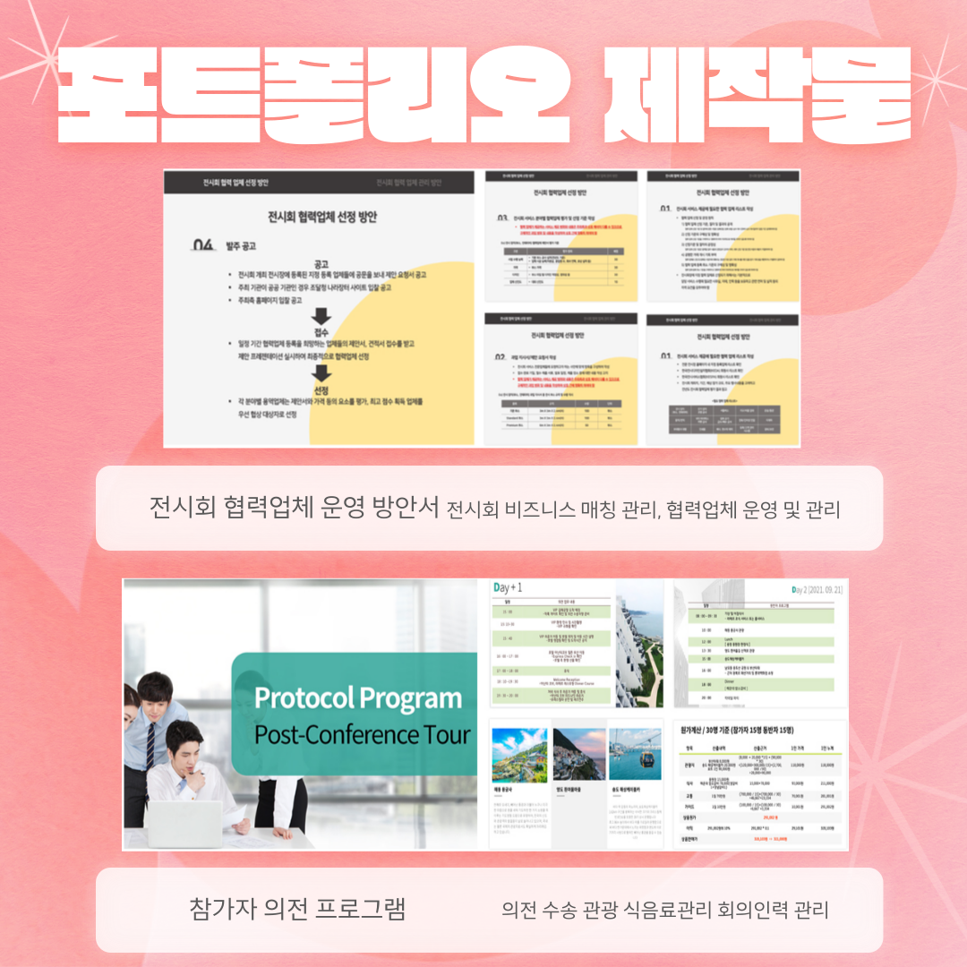 • 포트폴리오 제작: 국제회의, 전시 기획, 여행 상품 등 다양한 분야의 실무 중심 포트폴리오 완성