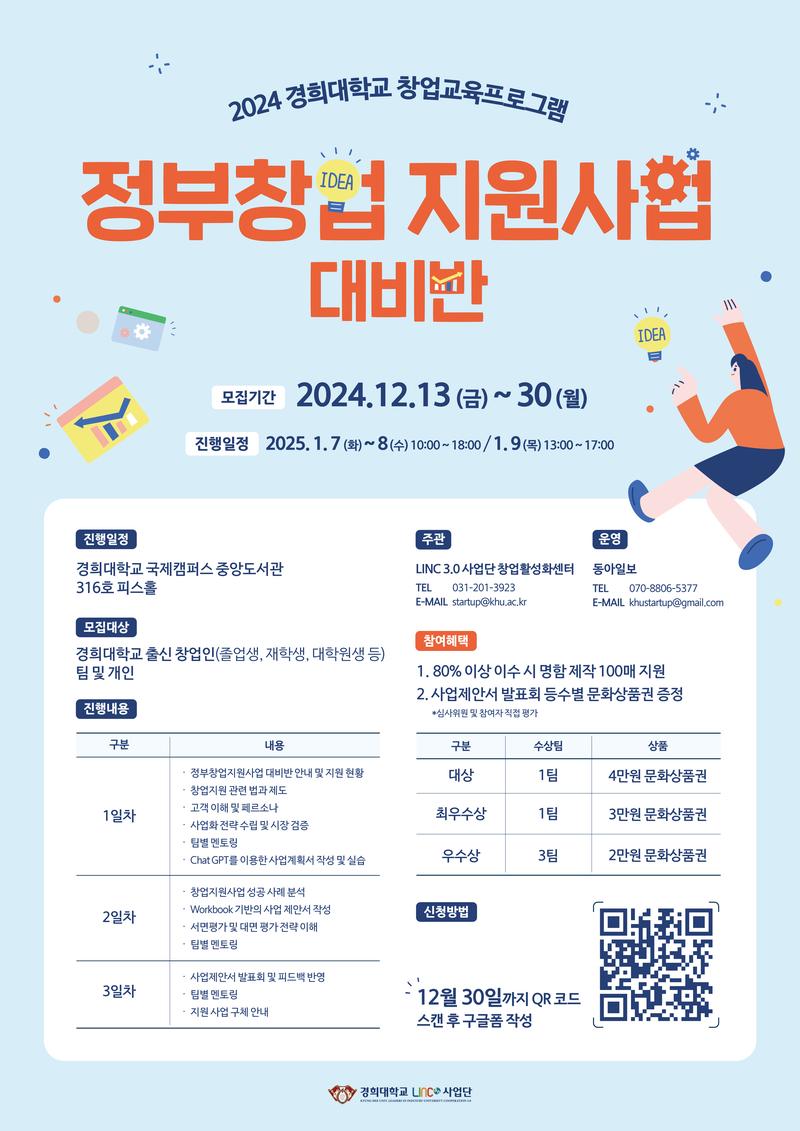 정부창업지원사업에 도전하고 싶은 경희대학교 학생들을 위한 다양한 교육 프로그램과 멘토링 지원을 준비했으니, 학생분들의 많은 관심과 참여 바랍니다! 😎👍