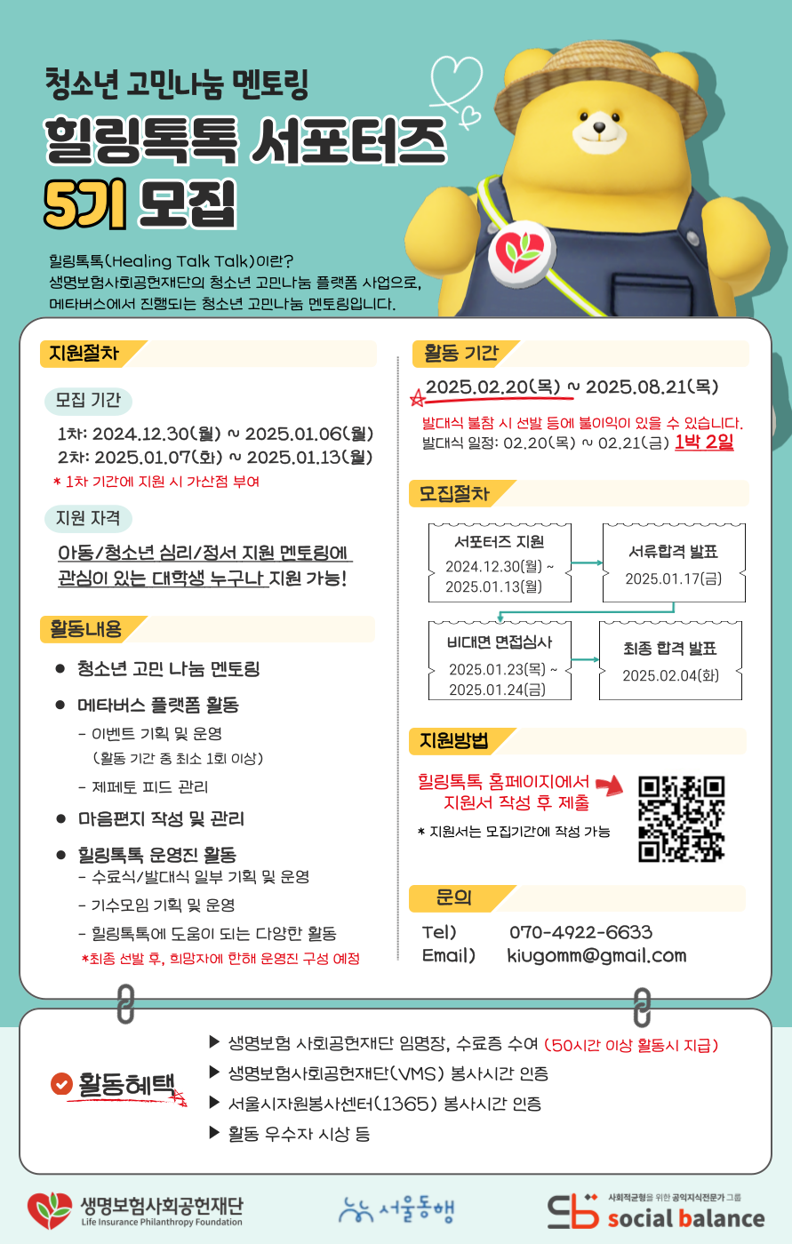 ■ 지원방법 : 힐링톡톡 홈페이지에서 지원서 작성