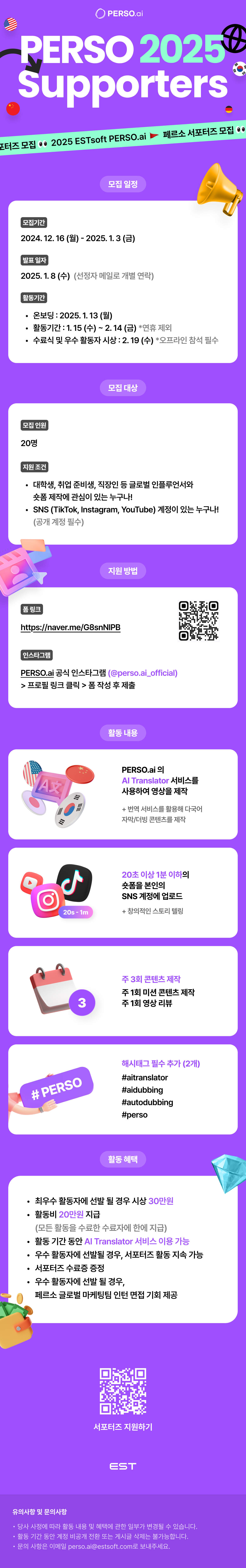 PERSO.ai의 AI Translator를 활용해 서비스를 직접 소개하며 다국어 영상 제작 경험을 쌓고, 글로벌 팬들과 소통하며 국제 콘텐츠 제작의 실무 감각을 키울 수 있는 기회!