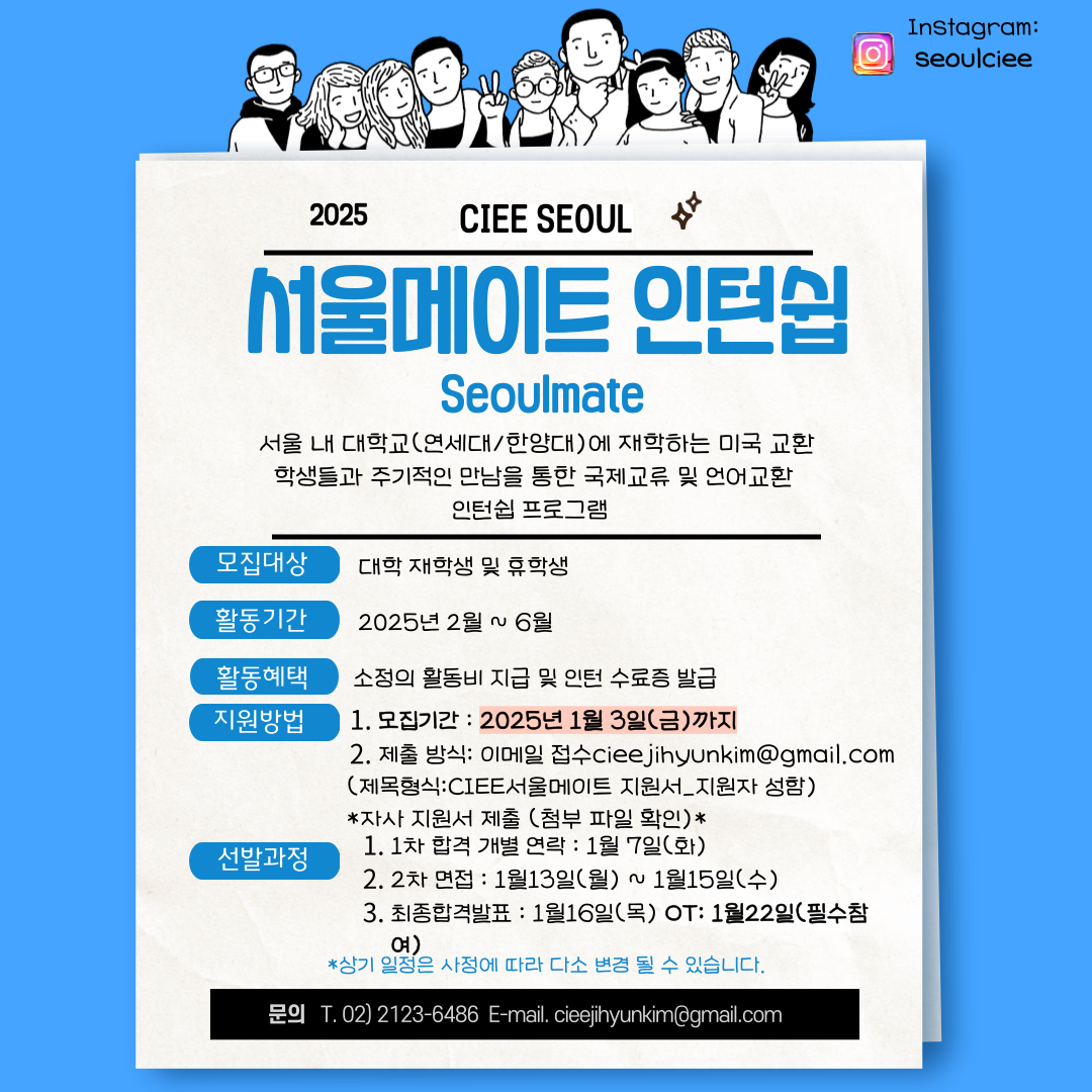 CIEE 서울사무소에서는 연세대학교 및 한양대학교와 파트너쉽을 맺어 미국 전역에서 오는 학생들을 위한 행정, 복지, 문화활동을 지원하고 있으며, 교환학생과 한국 대학생 간의 문화교류 프로그램의 일환으로 서울메이트를 모집하고 있습니다. 서울메이트는 연세대, 한양대 방문학생 및 CIEE 자체 프로그램 참여 학생들의 문화 및 언어 멘토로 활동하며, 문화 교류 프로그램을 기획 및 진행하는 역할을 하게 됩니다.