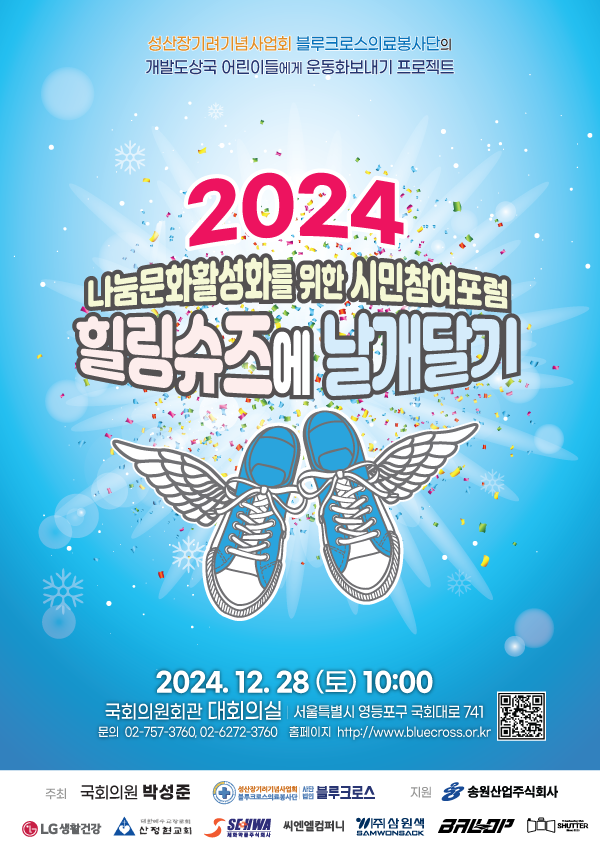 블루크로스의료봉사단이 한국의 슈바이처 장기려박사의 나눔의 정신을 이어서 '청십자(블루크로스)'라는 이름으로 활동한 지 이제 27주년이 되었습니다. 한 해를 마무리하고 또다른 나눔의 기적을 준비하며, 올해에도 시민들이 모두 함께 참여할 수 있는 '2024 힐링슈즈에 날개달기' 행사를 마련했습니다.