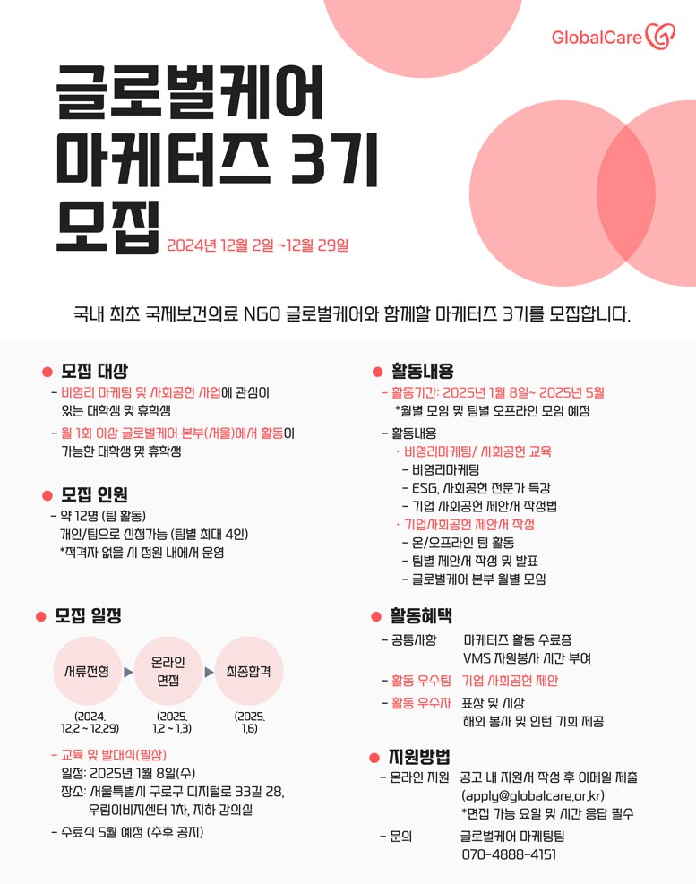 모두가 건강한 세상(Health for All)’을 꿈꾸는 글로벌케어와 함께할 마케터즈 3기를 모집합니다. 💗