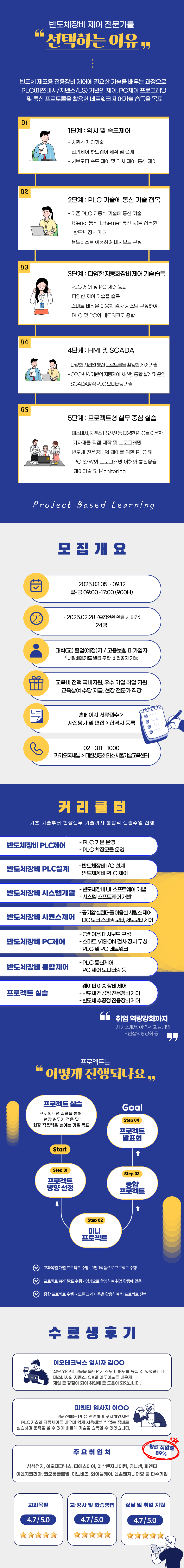 반도체 제조용 전용장비 제어에 필요한 기술을 배우는 과정으로 PLC(미쯔비시/지멘스/LS) 기반의 제어, PC제어 프로그래밍 및 통신 프로토콜을 활용한 네트워크 제어기술 습득을 목표로 합니다.