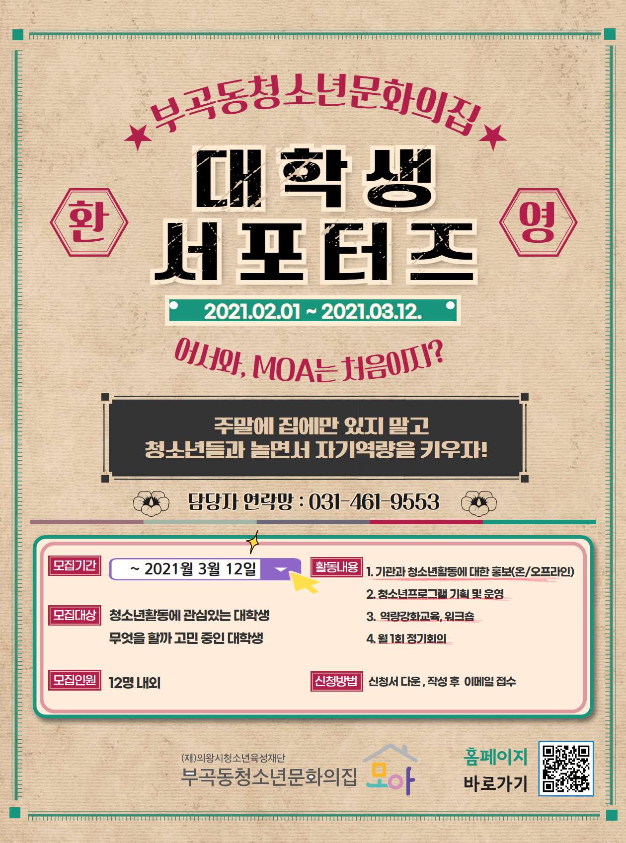 부곡동청소년문화의집에서는 참신한 아이디어와 열정이 가득한 대학생 서포터즈를 모집합니다. 청소년수련시설과 사회적 참여에 관심이 있는 대학생 여러분들의 지원을 기다립니다.